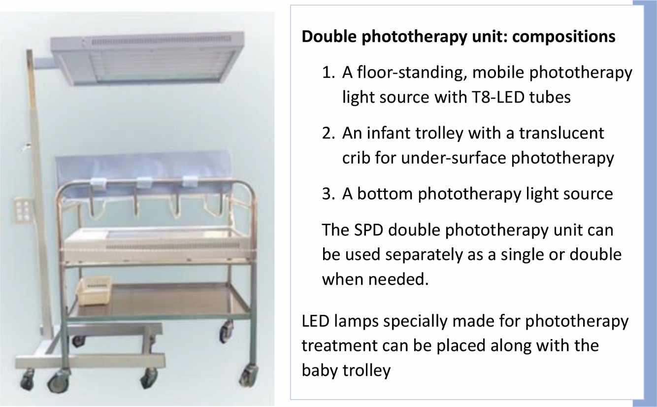 The Siriraj phototherapy device (SPD) was first produced in 1996 using fluorescent tubes to solve the high rate of blood exchange transfusions from hyperbilirubinemia at Siriraj Hospital, approximately 500 cases per year. The Siriraj phototherapy device has evolved significantly through continuous improvement, from daylight fluorescent tubes to special blue fluorescent tubes,1-4 and advanced to light-emitting diode (LED) tubes as a light source for intensive phototherapy. The advantage of SPD is that the traditional SPD using fluorescent tubes can be easily modified to use LED tubes by simply adding an LED conversion kit and replacing the fluorescent tubes with LED tubes, which helps the hospital save on the budget for purchasing a new LED phototherapy device. In addition, its T8-LED tube enclosure can also support the future development of LED tubes when compared to phototherapy machines using LED modules that may not be able to.