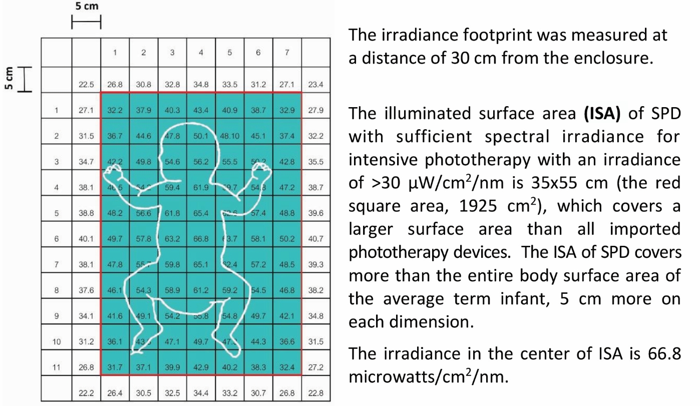 The use of six T8-LED tubes provides more light energy and uniform distributions of light energy. SPD emits a light energy of 66.8 microwatts/cm2/nm in the center of the ISA, covering the head to toes, with an average light energy of 49.5 μW/cm2/nm calculated from an ISA for 40-week-gestational-term infants of 30x50 cm (the blue-green area).